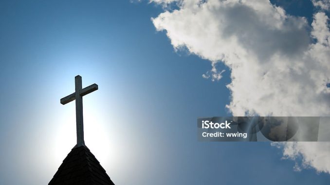 A wood cross on an old church steeple backlighted by a rising sun. Some copy space.